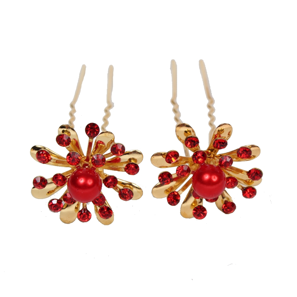 2 Haarnadeln Perlen Rot Gold Strass Blume Braut Hochzeit Ball Haarschmuck