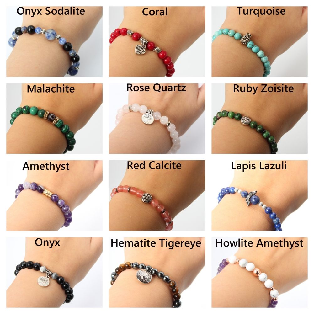 Alle Edelsteinarmbänder sind auf einem dehnbaren Gummiband aufgezogen, sodass diese leicht an- und ausgezogen werden können.