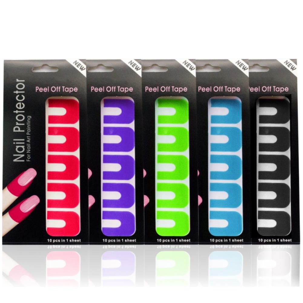 Das Paket beinhaltet 1 Blatt Einweg-Nagelhautschutz mit 10 Stück selbstklebenden Abzieh-Stripes in folgender Farbauswahl - schwarz, grün, rot, lila oder blau.
